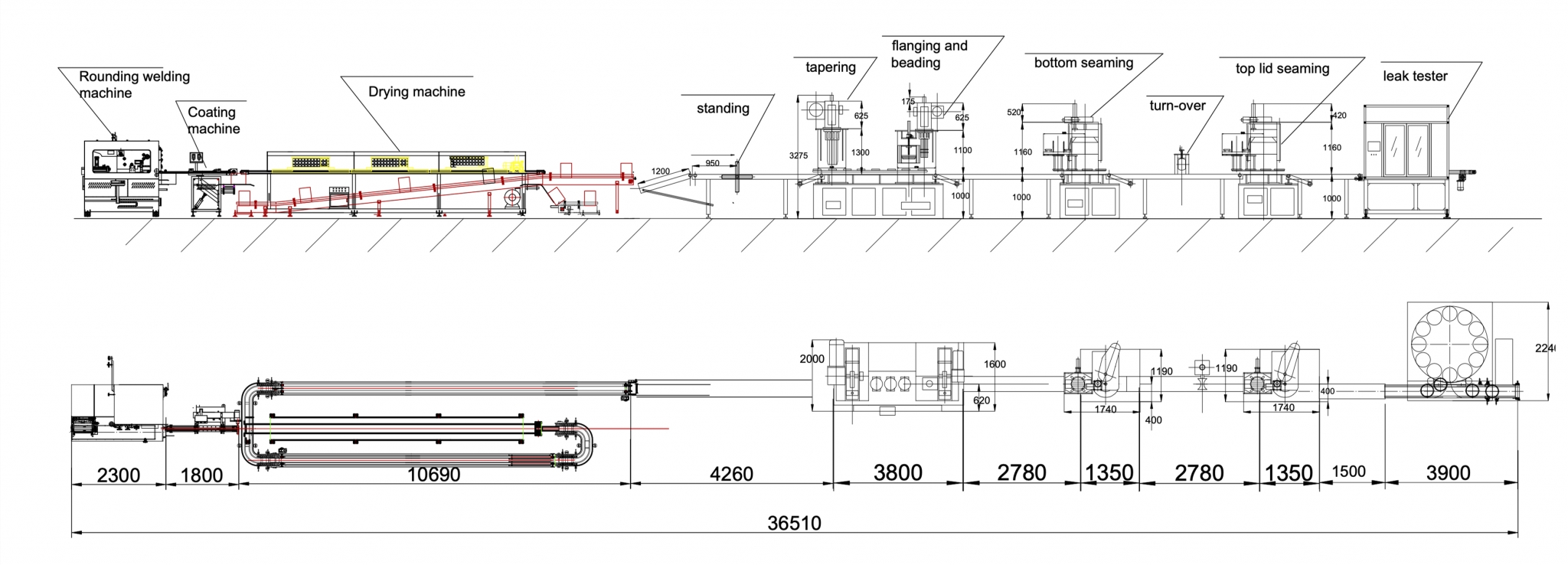 Technical flow: cutting the tin sheet to blank—rounding—welding—inner and outer coating (inner powder coating and outer coating)—drying—cooling conveying—conical expanding-flanging-beading-bottom lid feeding-seaming-turning over-top lid feeding-seaming-leak testing-packaging